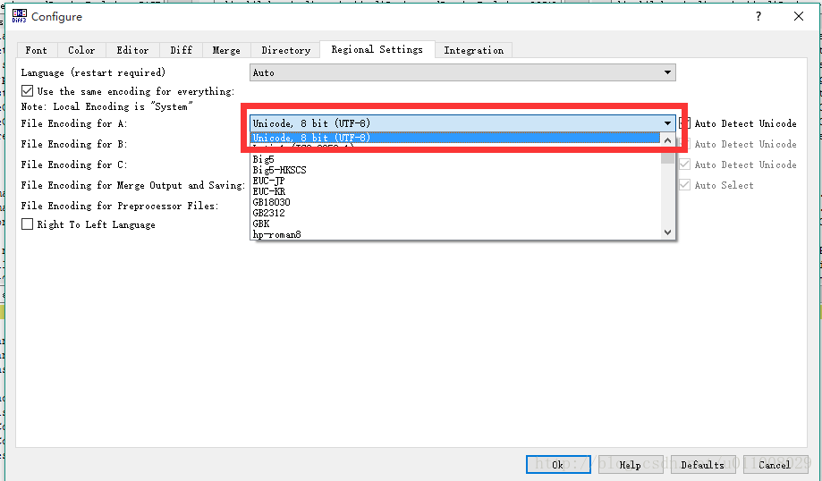 第二步:点击Regional Setting->File Encoding for A:选择Unicode,8 bit(UTF-8)