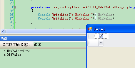6 7 8 // 9 // biIsOR 10 // 11 this->biIsOR->Caption = L"OR"; 12 this->biIsOR->Edit = this->repositoryItemCheckEdit2; 13 this->biIsOR->EditValue = false; 14 15 16 // 为biIsOR的Edit添加一个EditValueChanging事件,该事件捕获CheckEditValue。