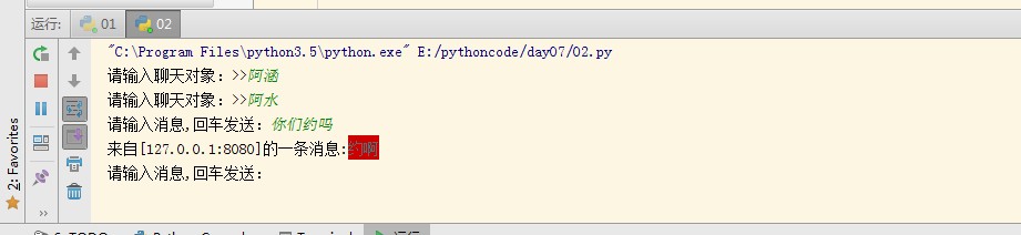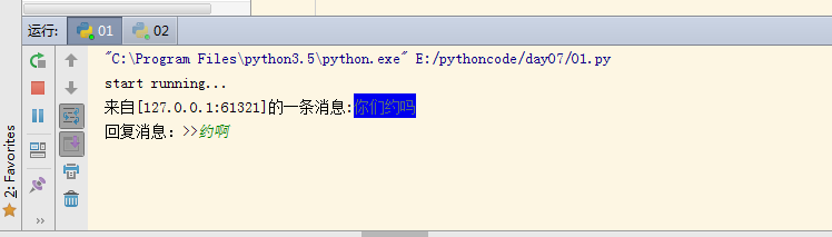 1 import socket 2 3 phone=socket.socket(socket.AF_INET,socket.SOCK_STREAM) 4 phone.connect(('192.168.20.44',8081))#绑定端口 5 while True: 6 cmd=input('>>请输入').strip() 7 if not cmd: continue 8 phone.send(cmd.encode('utf-8')) 9 data=phone.recv(10240) 10 print('返回的是%s'%data.decode('gbk')) 11 phone.close()