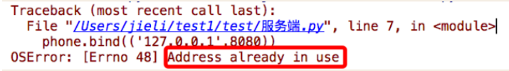 1 #加入一条socket配置,重用ip和端口 2 3 phone=socket(AF_INET,SOCK_STREAM) 4 phone.setsockopt(SOL_SOCKET,SO_REUSEADDR,1) #就是它,在bind前加 5 phone.bind(('127.0.0.1',8080))