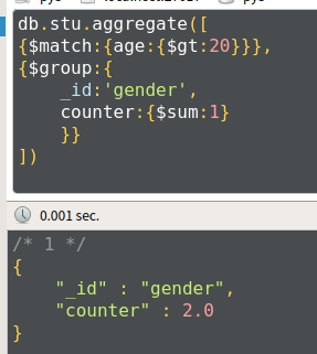 db.stu.aggregate([ {$match:{age:{$gt:20}}}, {$group:{_id:'$gender',counter:{$sum:1}}} ])