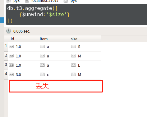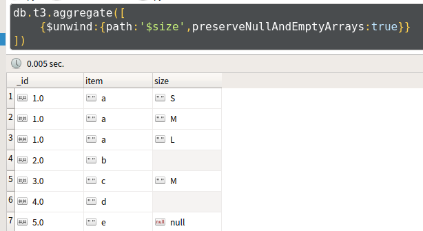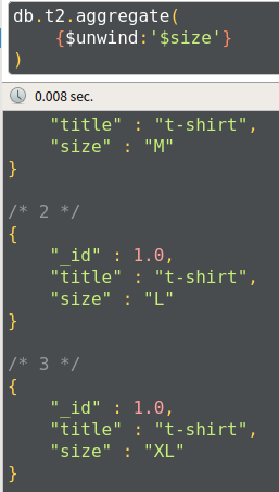 db.t3.aggregate([{$unwind:'$size'}])