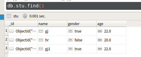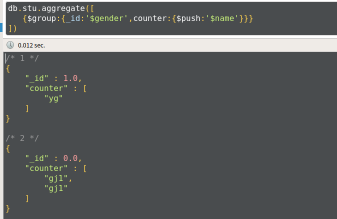 db.stu.aggregate([ {$group: { _id:'$gender', counter:{$sum:1} } } ])
