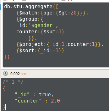 db.stu.aggregate([ {$group:{_id:'$gender',counter:{$sum:1}}}, {$sort:{counter:-1}} ])