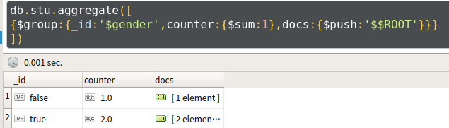 db.stu.aggregate([ {$group: { _id:'$gender', name:{$push:'$$ROOT'} } } ])