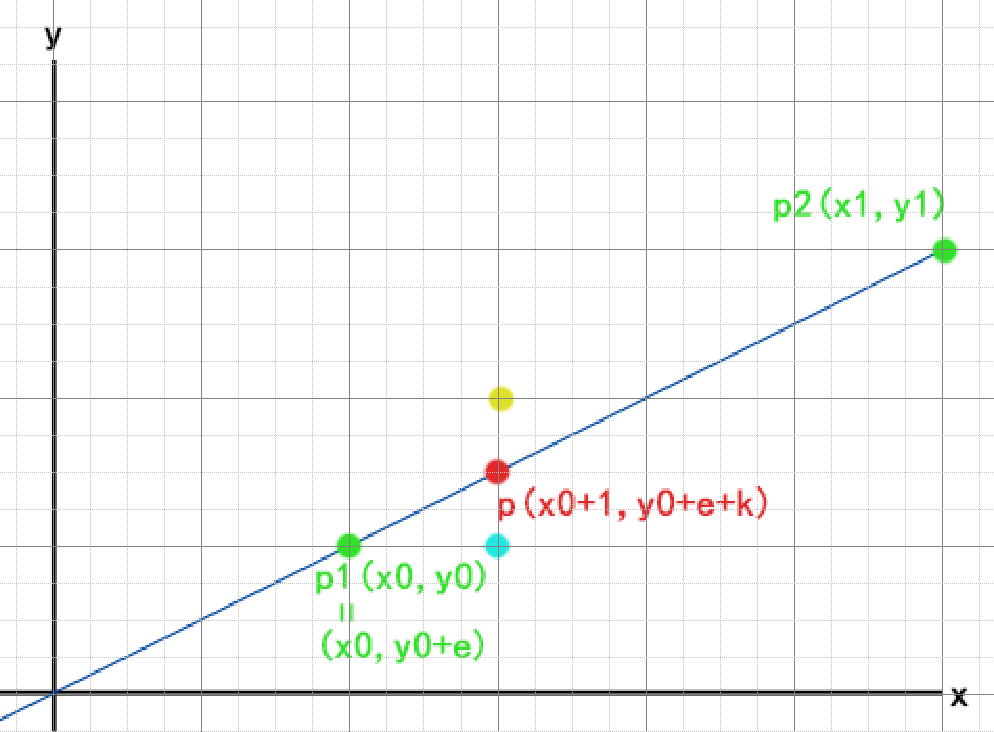 可以知道机器在画每一个点的时候都会有误差,则画出的第一个点的坐标(x0,y0)也相当于是(x0,y0+e),那么可以知道下个点的坐标为红色的p(x0+1,y0+e+k),但是机器在画p点时,如果p点的纵坐标不是整数时,应该进行判断这个点是接近黄点(x0+1,y0+1)还是接近蓝点(x0+1,y0),最后如果接近黄点则e累积k-1,如果接近蓝点则e累积k
