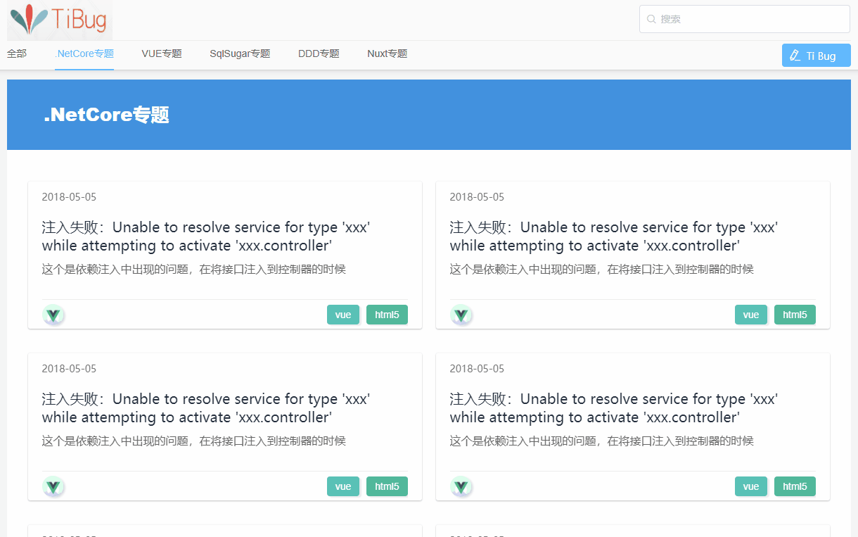这个时候我就在想,现在不仅很多 Github 上没有对项目的讲解(只有如何使用,没有如何开发),有讲解博文的吧,却没有太多精力去照顾那些真正入门的小伙伴,所以我就萌发了一个思路,一个项目,专门给我的这两个系列收集BUG,当然以后还会有,目前是 NetCore、Vue、DDD这三块,我的想法是,每一个小伙伴如果遇到了Bug,可以放到系统里,收集起来,当下一个入门的小伙伴也遇到问题的时候,可以在系统里看看,毕竟常见的就那么多,比如: