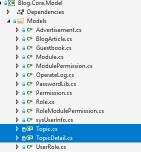 相信看这篇文章的,都是从第一个系列跟过来的铁粉儿,在Model层中,有那么些表,无论是做演示的博客表,还是JWT权限模块的那几个用户、角色、菜单等表,剩下的就是无用的广告表,和 Topic和TopicDetail表了,你一定很好奇,这一块一直没有提到,是干啥的?没错!今天终于派上用场,是不是有种写小说的伏笔一样(其实这是我之前项目里,用来记录我写名著读后感的表?),今天就正好拿来提bug了,如果你感觉不合适,可以修改下表名,或者新建两个表,我就直接使用这两个了,一个是Bug专题,一个是内容。