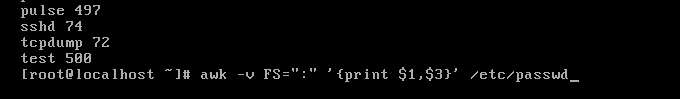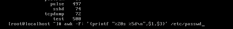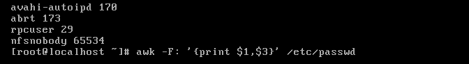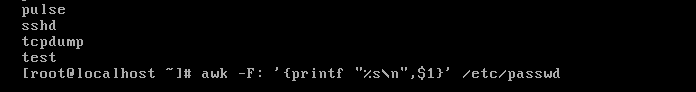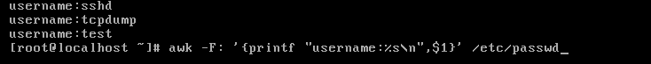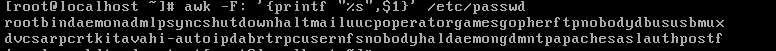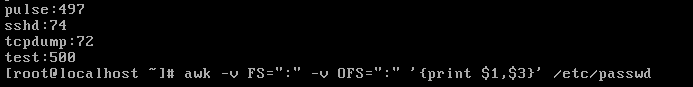 可以看到上图的输出内容,字段之间以空格分隔。使用OFS指定以:分隔。