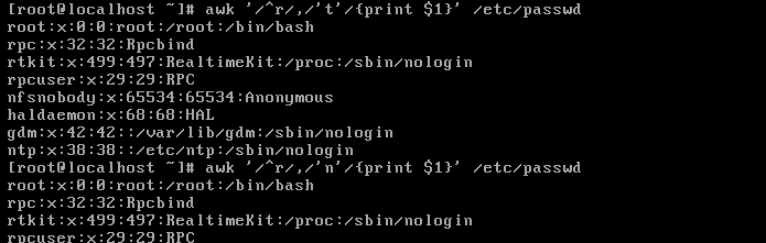 匹配第一个以r开头的行到第一个以t开头的行。但是我们会发现并没有输出t开头的行,结合第二个命令的输出。