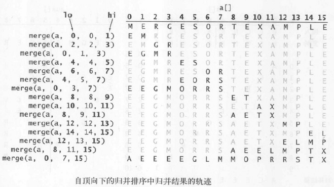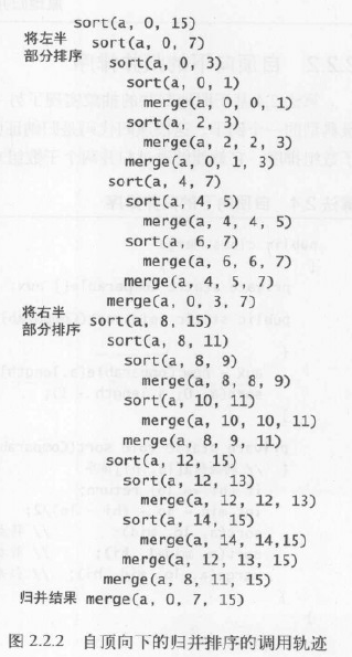要理解归并排序就要仔细研究该方法调用的动态情况,如下图中的轨迹所示。要将a[0..15]排序,sort()方法会调用自己将a[0..7]排序,再在其中调用自己将a[0..3]和a[0..1]排序。在将a[0]和a[1]分别排序之后,终于才会开始将a[0]和a[1]归并(简单起见,我们在轨迹中把对单个元素的数组进行排序的调用省略了)。第二次归并是a[2]和a[3],然后是a[0..1]和a[2..3],以此类推。从这段轨迹可以看到,sort()方法的作用其实在于安排多次merge()方法调用的正确顺序。