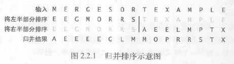 将两个有序的数组归并成一个更大的有序数组,很快人们就根据这个操作发明了一种简单的递归排序算法:归并排序。要将一个数组排序,可以先(递归地)将它分成两半分别排序,然后将结果归并起来。你将会看到,归并排序最吸引人的性质是它能够保证将任意长度为N的数组排序所需时间和NlogN成正比;它的主要缺点则是它所需的额外空间和N成正比。简单的归并排序如下图所示: