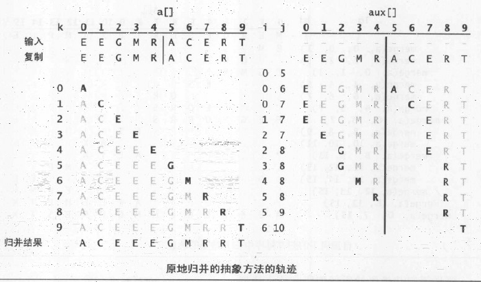 此算法基于原地归并的抽象实现了另一种递归归并,这也是应用高效算法设计中分治思想的最典型的一个例子。这段递归代码是归纳证明算法能够正确地将数组排序的基础:如果它能将两个子数组排序,它就能够通过归并两个子数组来将整个数组排序。
