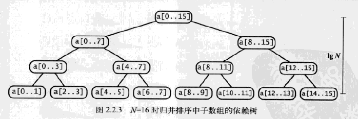这段代码也是我们分析归并排序的运行时间的基础。我们也可以通过下图所示的树状图来理解命题。每个结点都表示一个sort()方法通过merge()方法归并而成的子数组。这棵树正好有n层(n=4,n为lgN,lg是以2为底)。对于0到n-1之间的任意k,自顶向下的第k层有2k个子数组,每个数组的长度为2n-k,归并最多需要2n-k次比较。因此每层的比较次数为2kx2n-k=2n,n层总共为n2n=NlgN。
