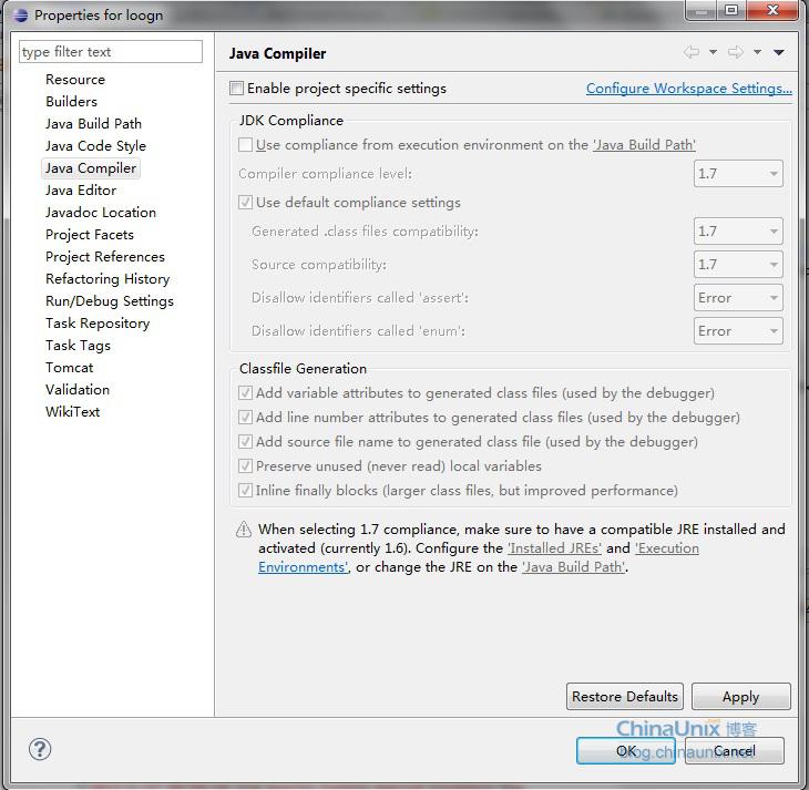 接着:在Java Compiler设置,勾选Enable project specific settings,然后在1.7下拉框下选择1.6,点击Apply,接着OK!