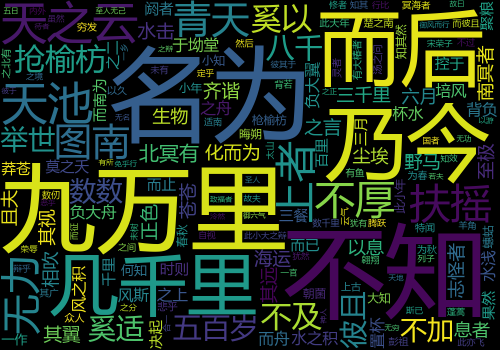 import wordcloud import jieba import time start=time.perf_counter() f=open('xyy.txt','r',encoding='gbk') #这里的编码格式还不太了解,有的用utf-8,有的用gbk t=f.read() f.close() ls=jieba.lcut(t) txt=' '.join(ls) w=wordcloud.WordCloud(font_path='msyh.ttc',width=1000,height=700,stopwords={}) w.generate(txt) w.to_file('逍遥游.png') dur=time.perf_counter()-start print('耗时{0:.2}s'.format(dur))