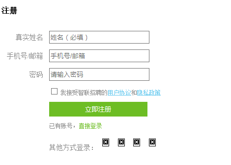 这是一个关于智联招聘网站注册页面的HTML代码示例,包含姓名、手机号/邮箱及密码输入框,并附带用户协议和隐私政策链接。