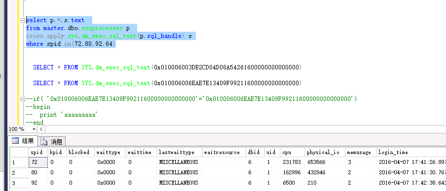 查看数据库的会话占用的tempdb的空间大小,然后根据SPID查看详细信息,然后查处会话的具体信息