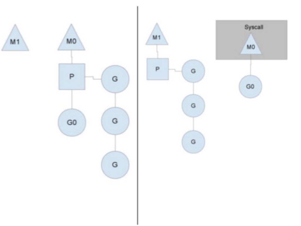 如上图左图所示,M0中的G0执行了syscall,然后就创建了一个M1(也有可能来自线程缓存),(转向右图)然后M0丢弃了P,等待syscall的返回值,M1接受了P,将继续执行Goroutine队列中的其他Goroutine。