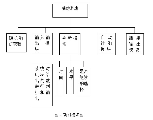游戏分为随机数的获取,输入输出模块,判断模块,自动计数模块,结果输出模块。其中输入输出模块中系统会对玩家给出的数进行判断和输出。判断模块会对玩家的水平进行判断,并计算出玩家所用的时间和次数。