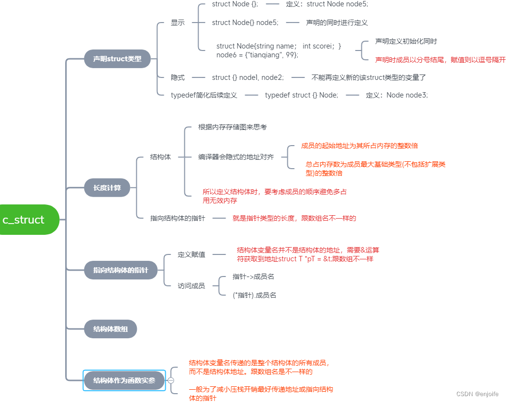 c语言结构体基础 + 难点梳理 概述结构体跟数组完全不一样,许多特性反而跟基本类型一致; 声明时,成员以分号结尾,赋值时则以逗号隔开; 长度计算,根据内存存储图来思考: 成员起始地址为期所占内存的整数倍 总占内存数为成员最大基类型(不包括扩展类型)的整数倍 所以定义结构体时要考虑成员间的顺序,以便减少无效内存占用 结构体变量名就是所有成员的集合,需要其地址的话要用&结构体名1. 结构体基本语法代码 1 /* 2 * author: tianqiang 3 * date :202..