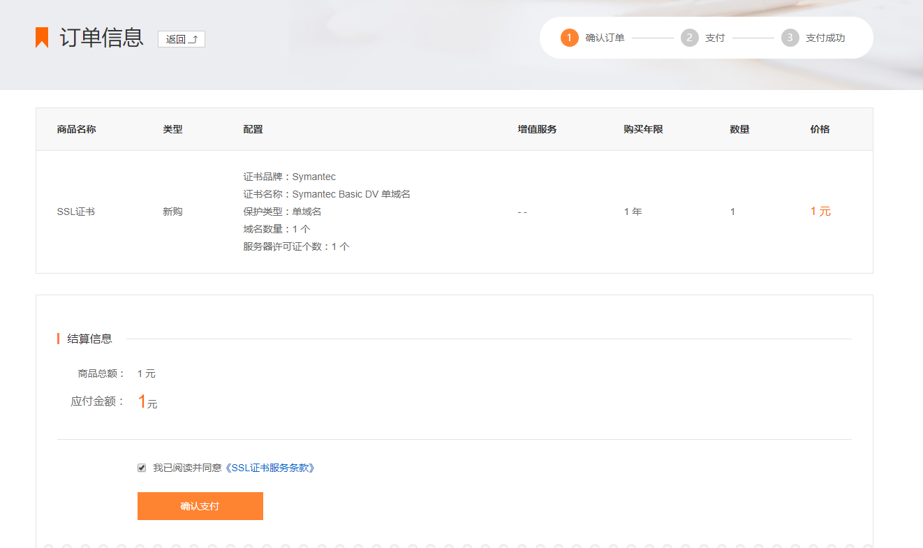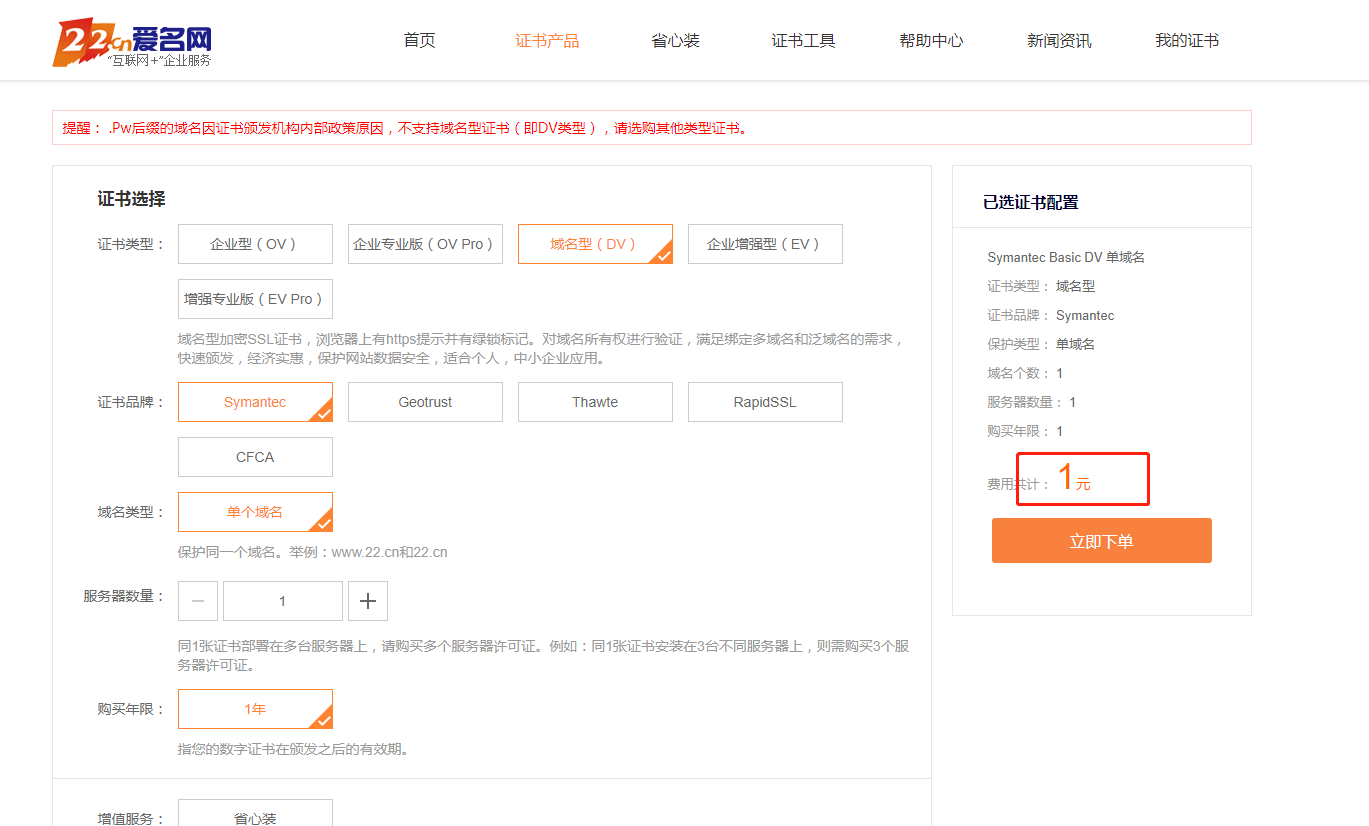 SSL认证的证书类型有几种,我购买的是现在的活动证书【域名型】,只需一元~选好后点击【立即下单】