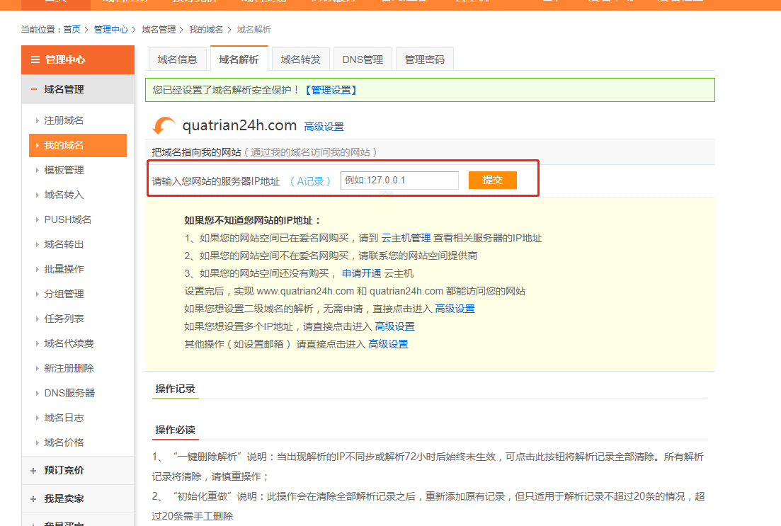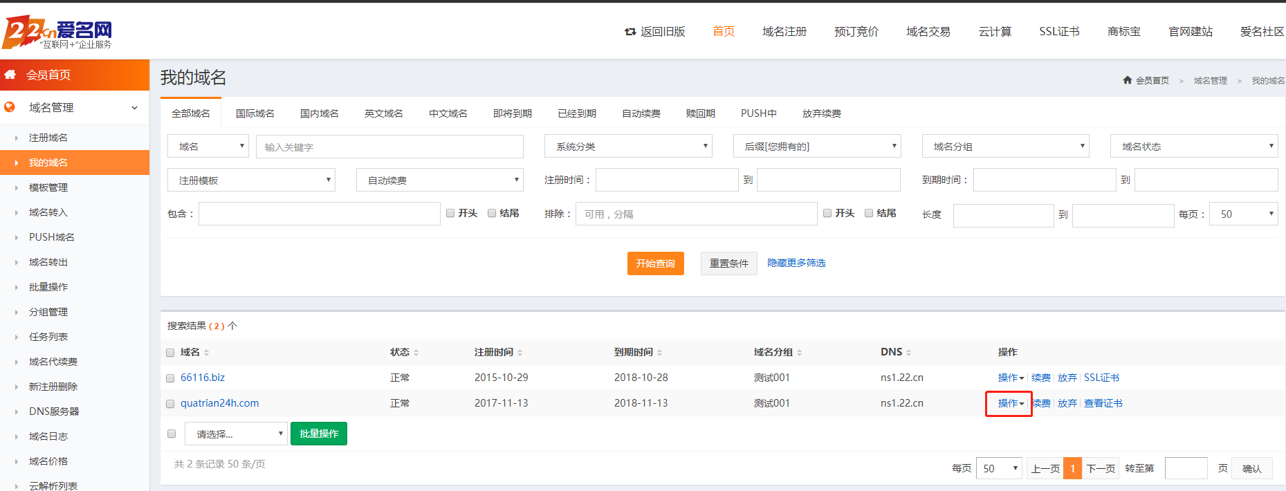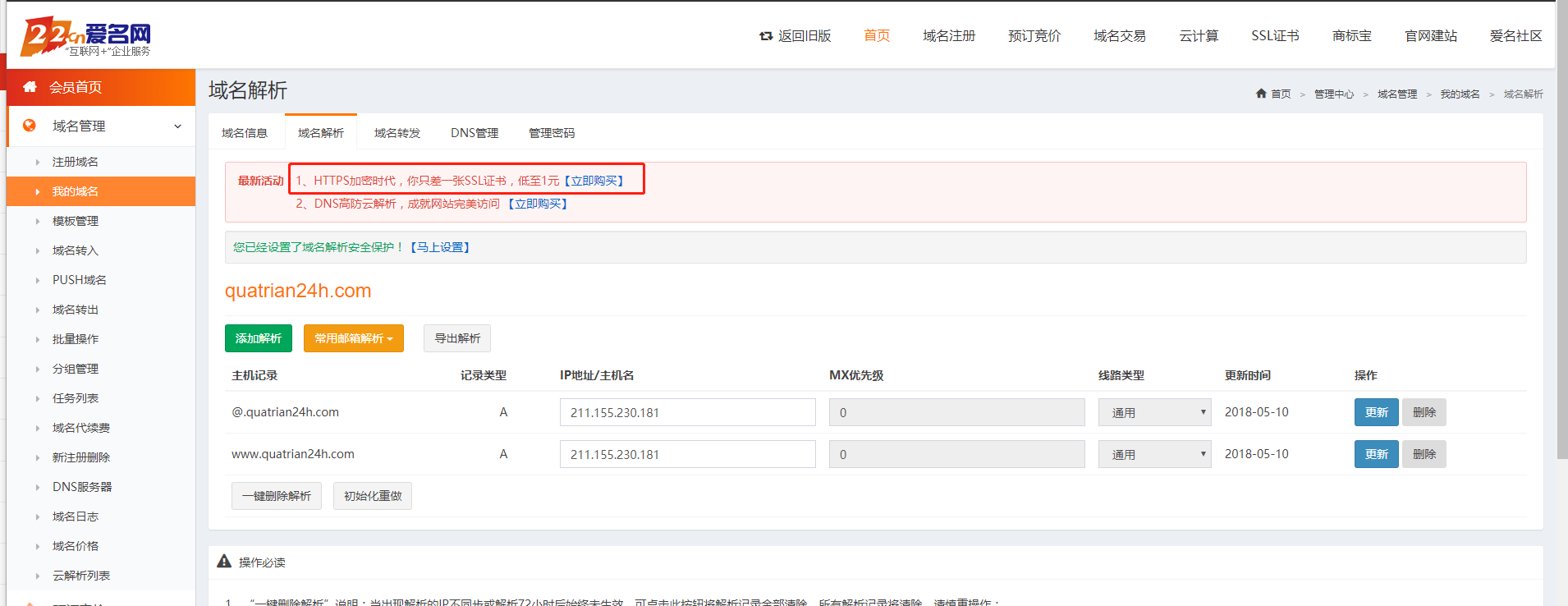 在【我的域名】模块,选择你要解析的域名【操作】里点击【域名解析】