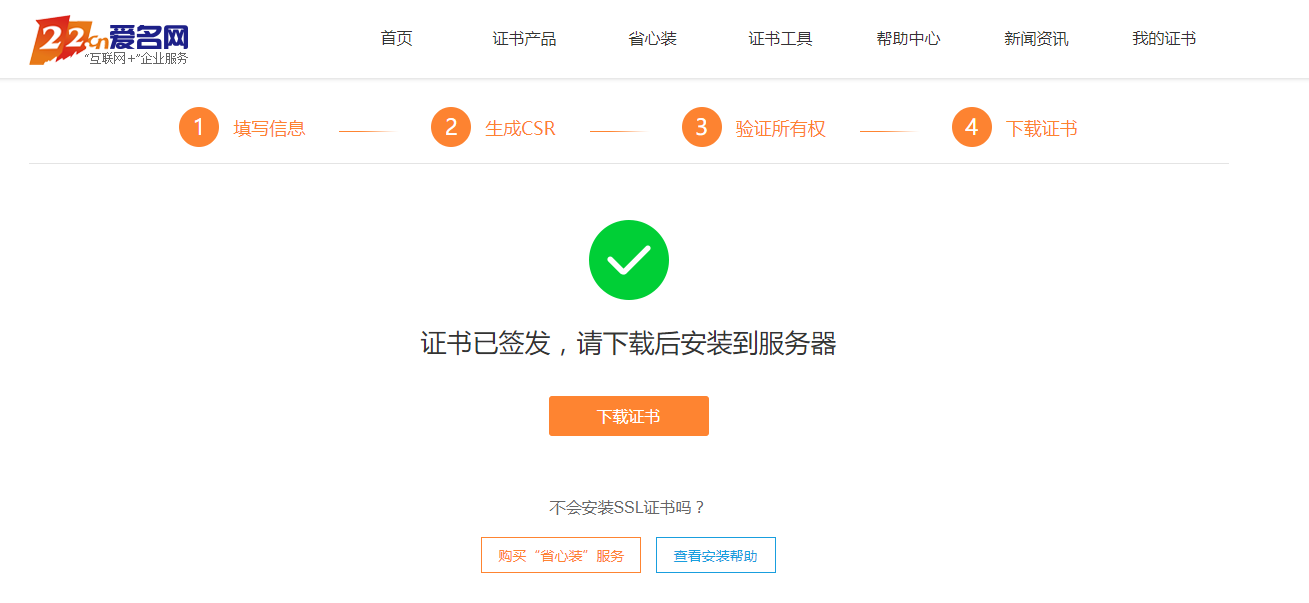 购买证书后,按照步骤填写相关信息,提交后生成CSR文件,并验证所有权后签发证书,点击【下载证书】即可。