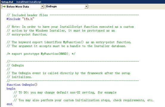 A: Installation Designer -> Behavior and Logic -> InstallScript ->Setup.rul,没有这个文件的话在file底下new一个,默认就是这个名字的,我是在Installscript msi类型下测试的,其他的可能略有不同。