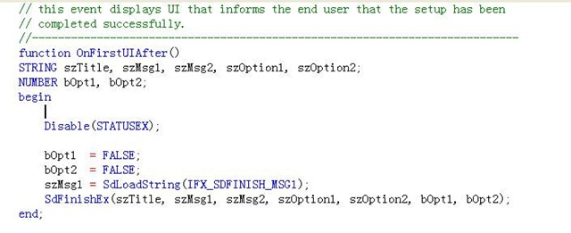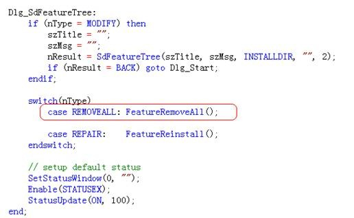 这两句话作用分别是停止日志记录和使日志记录重新生效,这是从网上的一篇心得里抄录的,当日志停止记录时候,安装程序就无视了停止日志后的所有操作,这样保证键值不会在反安装时候被操作;其实本来上面一句if(!MAINTENANCE)then(非维护状态时操作)在原文是没有加上去,作者说只要不让日志记录到操作注册表,这个操作就不会被反安装掉,不过好像自己试了一下不行,加上一句,比较保险些,至少试验出来是没问题的。
