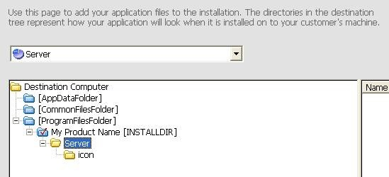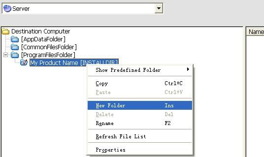 选择第一个Feature, 即Server,点击My Product Name[INSTALLDIR]节点,右键点击,在菜单上选择New Folder来创建一个文件夹。