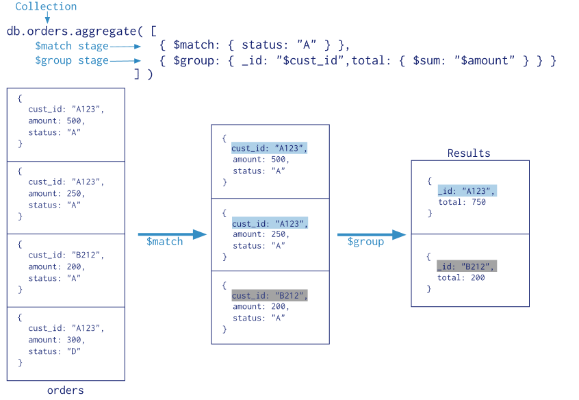看一下图例,所有的数据先经过$match命令,只留下了status为A的数据,接着,对筛选出的数据进行聚合操作,对相同cust_id的数据进行计算amount总和的操作,最后输出结果。