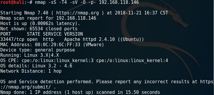 nmap -sS -T4 -sV -O -p- 192.168.118.146