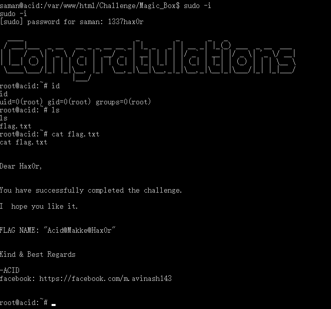 再使用sudo -i 提权到root,密码同样是1337hax0r,获得位于root目录的flag.txt