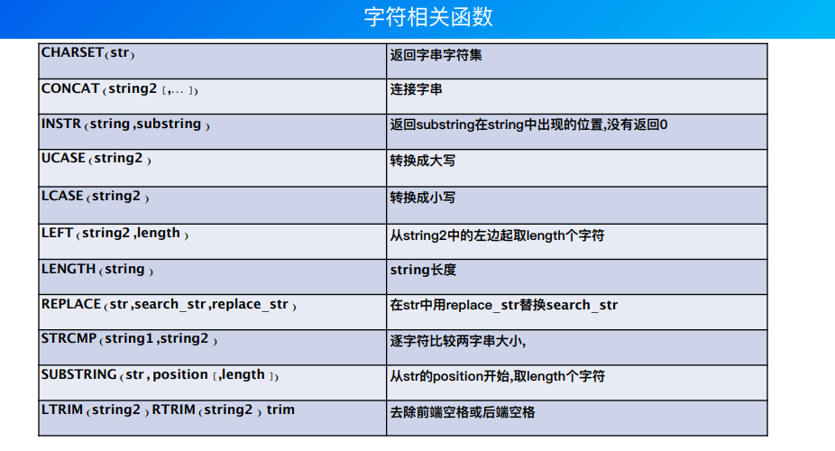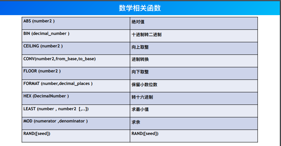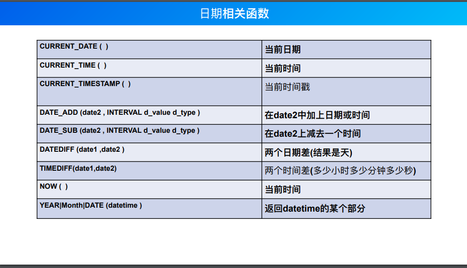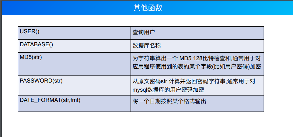 在SQL 语句中,表达式可用于一些诸如SELECT语句的ORDER BY 或 DELETE或 UPDATE语句的 WHERE ⼦句或 SET语句之类的地放。使用文本值、column值、NULL值、函数、 操作符来书 写 表达式。这些内置函数极大提高了我们的开发效率。