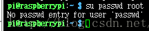 当从root用户切换到pi用户后,我们再次使用su passwd root来修改密码,会报错