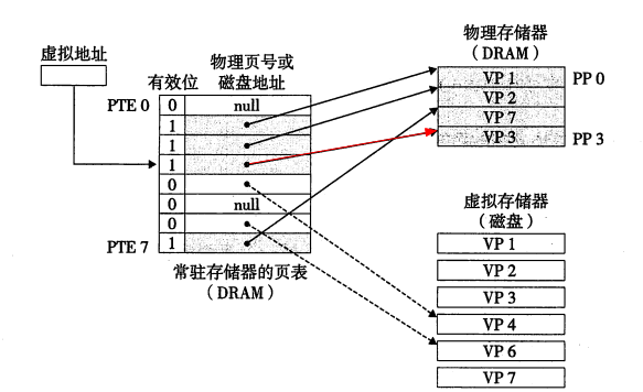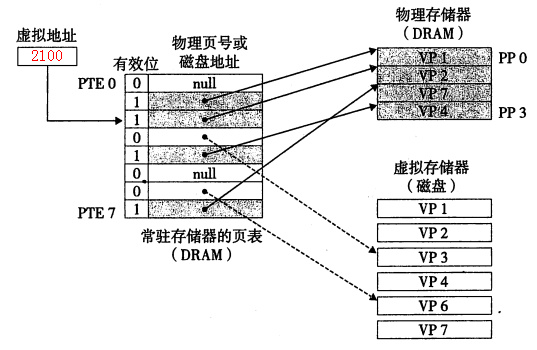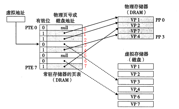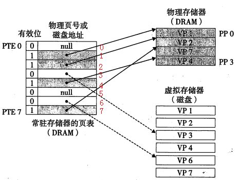 虚拟页vp1,2,7,4当前被缓存在内存中,页表上有效位设置成1,分别用PTE1,2,4,7表示。VP0和VP5(PTE0、5)未被分配,VP3和VP6被分配并指向虚拟内存,但未被缓存。