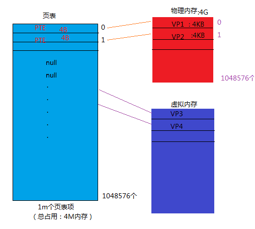 这样做的好处是,如果一级页表中有未被分配的项目,那么这条PTE直接设置成null,不指向任何二级列表,也就不再占用空间。还有一个好处是不是所有的二级列表都需要常驻内存,每个进程只需要在内存中建立一级页表(4kb)大小,二级列表按需要的时候创建调入,这样就更省了。只有最近经常使用的二级页表才需要缓存到内存中。