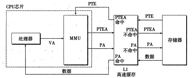 高速缓存被放在存储器和MMU之间,可以缓存页表条路。当MMU发送一个PTEA请求的时候,优先从高速缓存中寻找相应的PTE值,如果命中直接返回给MMU,如果不命中从内存中获得并发送到高速缓存,再由高速缓存返回到MMU。(高速缓存使用的是物理寻址,不涉及地址保护问题,因为MMU已经加入了保护标识位)