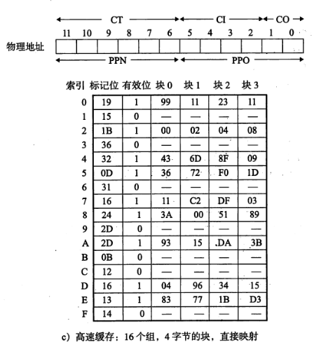 3 > 根据物理地址:0x354,我们在高速缓存中去碰碰运气,前面假设的时候我们说过大小为64B,我们将其分成16个条目,由:标记位+有效位+块0-3组成。其实际存放数据的块每个条目只有4个(0-3)所以总大小为64B,我们的物理地址要到高速缓存中去寻找数据,就得有某种对应方式。其中物理地址的低2位用作偏移量(CO)因为每个条目只有4个数据块,紧接着的4位表示组索引,因为一共是16个组,最后的高7位作为标记位。我们形成如下的:CO=0x0,偏移量为0也就是块0的内容;CI = 0x05也就是第0x05组和CT:0x0d标志位。有了这些内容以后我们返回到假设5中去寻找,发现高速缓存中的5号索引,标记位为0x0d,并且有效,读取块0处的内容为36。这就是我们要返回给CPU的内容。至此完成了一个端到端地址翻译并返回数据的手工模拟,当然我们还可能遇到很多不同的情况。如在高速缓存中不命中,TLB不命中等等,但大致原理几乎类似,请自行脑补。