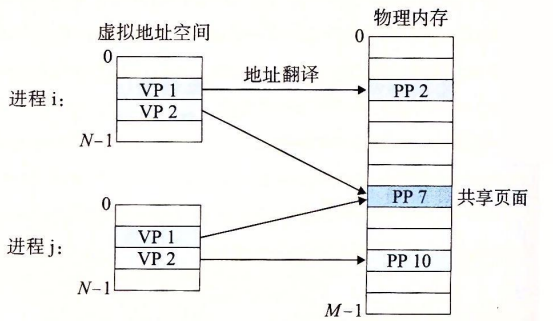 进程i将VP1映射到了内存的PP2处,VP2映射到了内存的PP7处。进程j将VP1映射到了内存的PP7,将VP2映射到了PP10处。