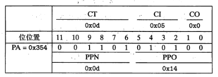 组索引在0x03号位置,标记也为0x03,这时候回到我们的假设“4>”处进行检查,发现0x03组,标记位0x03处的有效位是1,所以命中。取出物理页号(PPN)0D用于构造物理地址用。物理地址就为:PPN-VPO = 0x354(0011 0101 0100):