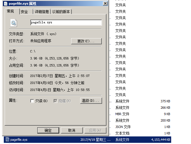 我们先来看看虚拟内存,就windows系统而言是保存�在磁盘上的一个文件,存放于C盘的pagefile.sys点击属性可以看到其大小为3.96G,这相当于一个仓库,保存着临时需要又还没用到的数据。