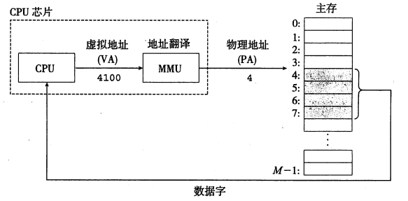 使用虚拟寻址的时候,cpu先是生成一个虚拟地址:4100再经过地址翻译器,将4100翻译成物理地址。