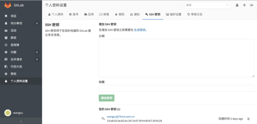 1.打开Gitlab登录自己的账户,进入用户设置,找到SSH keys