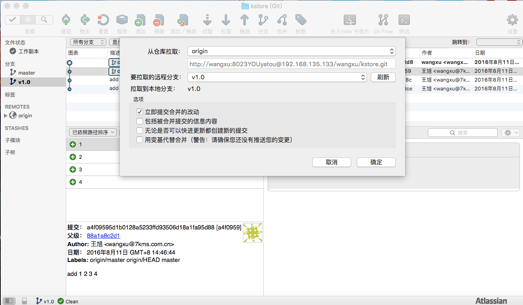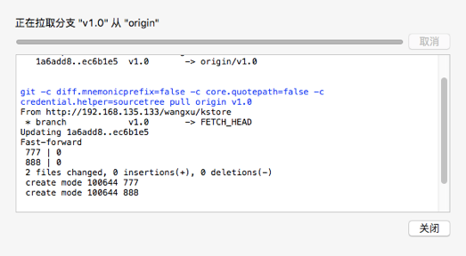[root@localhost kstore]# git pull From http://localhost/wangxu/kstore * [new branch] v1.0 -> origin/v1.0 Already up-to-date. [root@localhost kstore]# git branch -a * master remotes/origin/master remotes/origin/v1.0 [root@localhost kstore]#