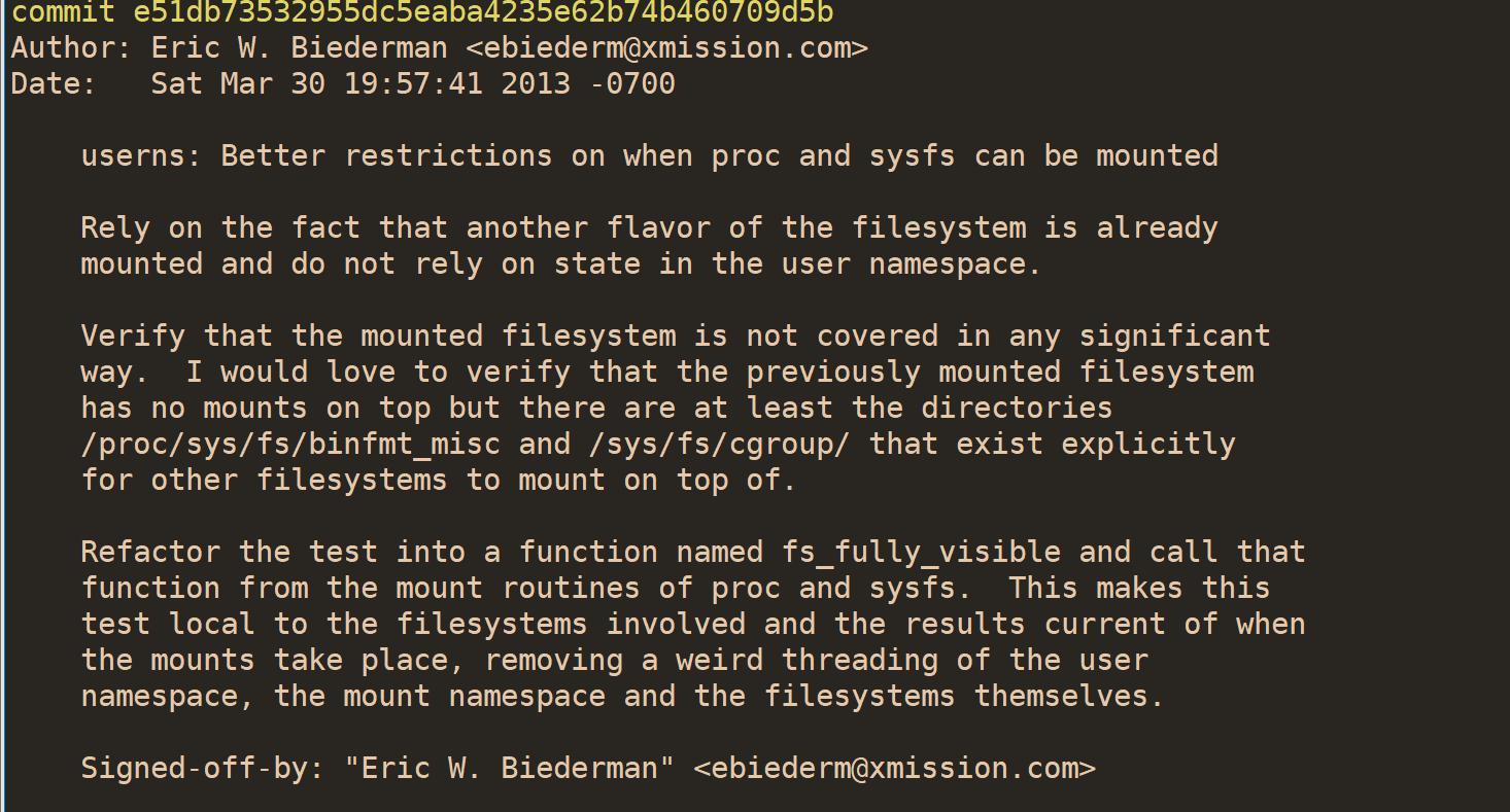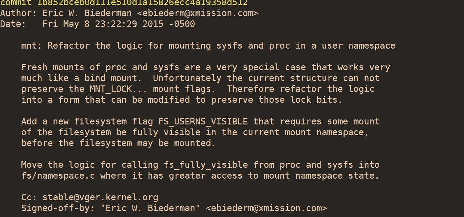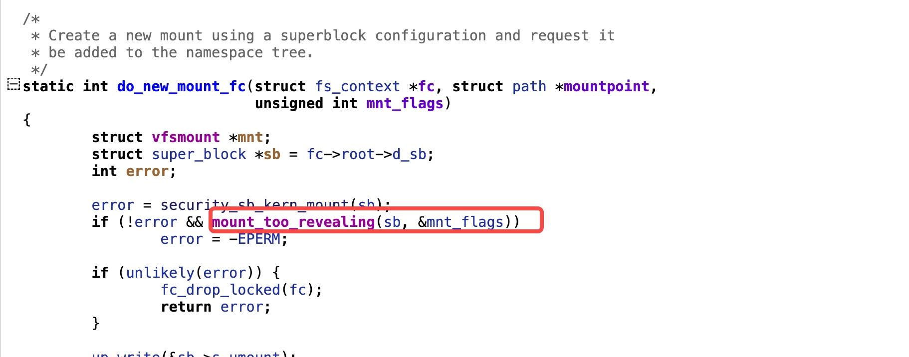 mnt_already_visible会遍历新的 mount namespace 并且检查是否有子挂载点,如果已经有子挂载点并且不是全部对当前 mount namespace 可见,则不能挂载 proc 和 sys。原因如下:procfs 和 sysfs 包括许多全局数据,不能直接挂载到容器中。