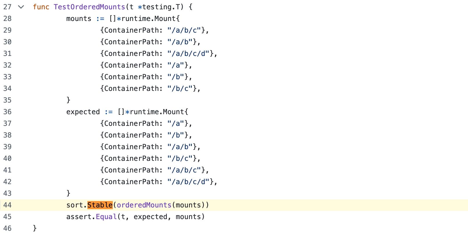有个有意思的点,containerd 社区给OrderedMounts 加了单元测试,用例中用的 sort.Stable,但代码逻辑中实际用的是 sort.Sort。可能默许了 sort.Sort 包含稳定排序的特征,只不过在 Golang 1.19 被打破了,才导致的问题。